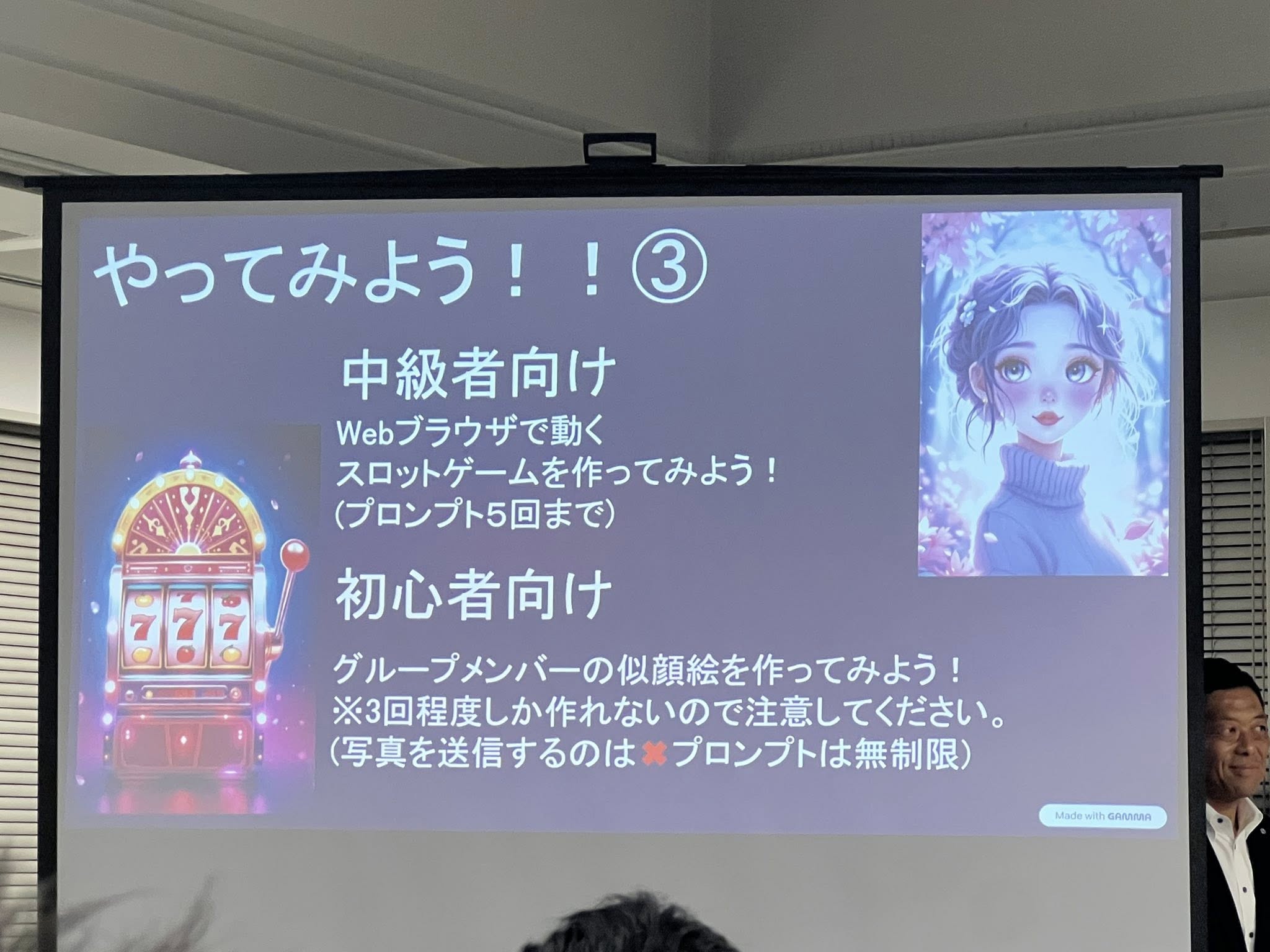 2部では実際にchatGPTを使い旅行の計画を立てたり、似顔絵の作成やコードを書いてもらいスロットゲームを作りました。