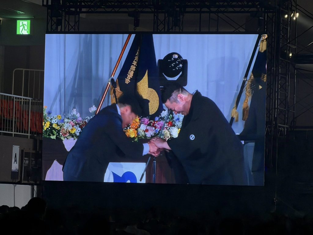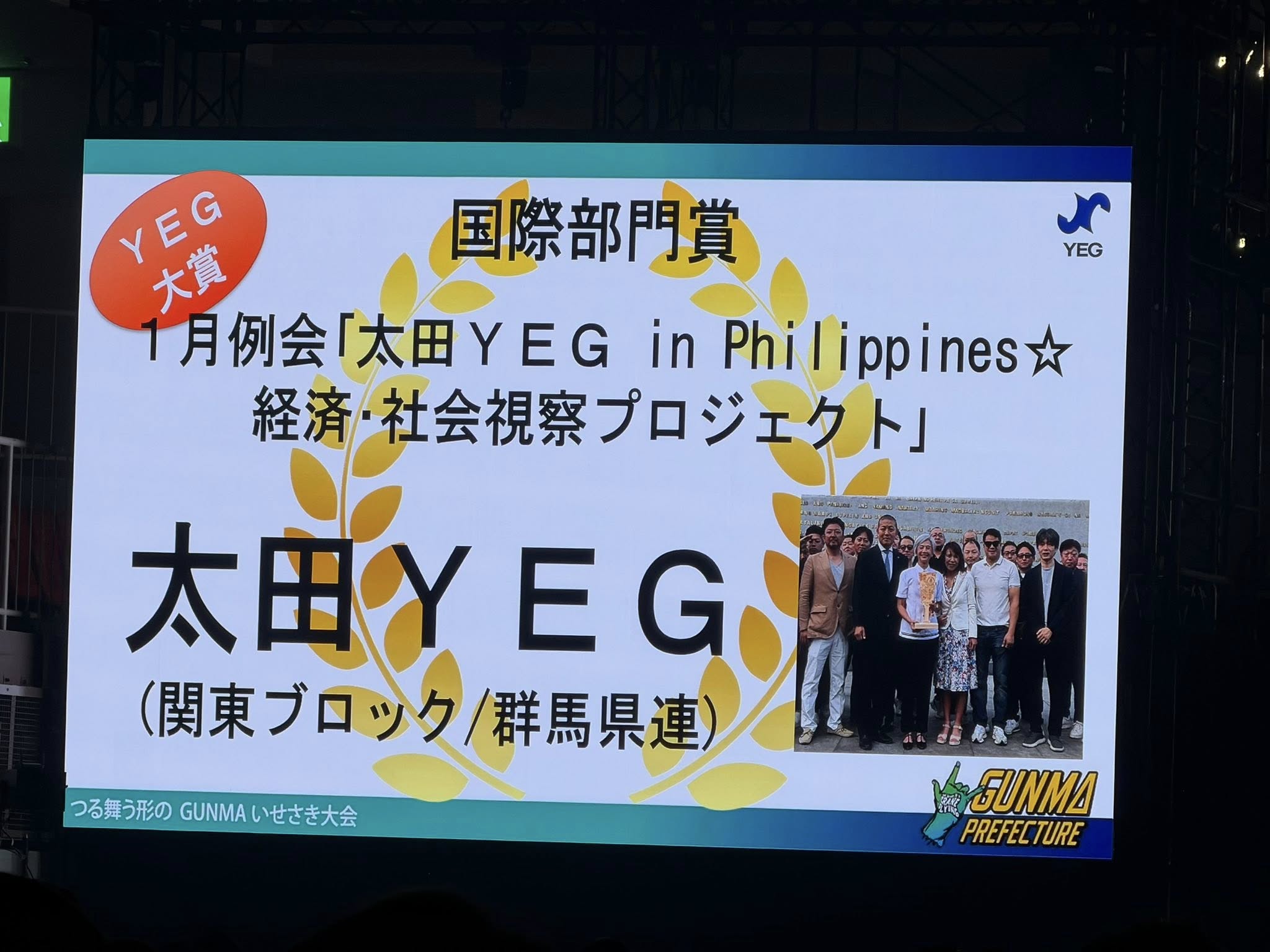 今回行われた 記念式典の中で全国のYEGが行ってきた事業から特に素晴らしい事業が表彰されるYEG大賞において国際部門賞で太田YEGが昨年後藤委員長のもと行われた「太田YEG In philippines 経済・社会視察プロジェクト」が大賞に選ばれました。大賞に選ばれた瞬間太田YEGメンバーから歓喜の声が上がりました。